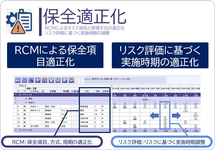 RCMï¼ˆä¿¡é ¼æ€§ä¸å¿ƒä¿å…¨ï¼‰ã‚„リスク評価を用ã„ãŸè¨ˆç”»èª¿æ•´ãŒå˜åœ¨ã—ã¾ã™ã€‚
