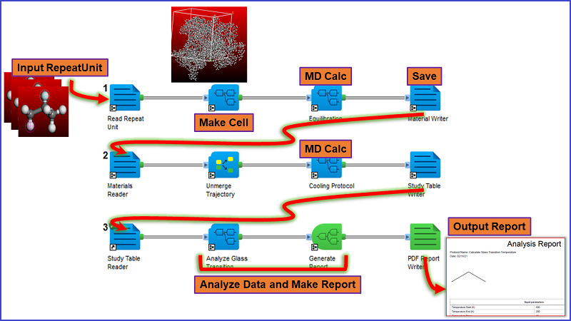 本プロトコルの実行によって出力されたpdfレポートを下に示します。 まずレポートの1ページには、インプットされた繰り返し構造や計算条件が、 2~3ページには熱膨張などから求められたガラス転移温度が記述されています。 それによると、ポリプロピレンの計算結果は300K程(27度程)となっており、文献値の270K程(-10度程)と比較的近い値が取れているとわかります。 |