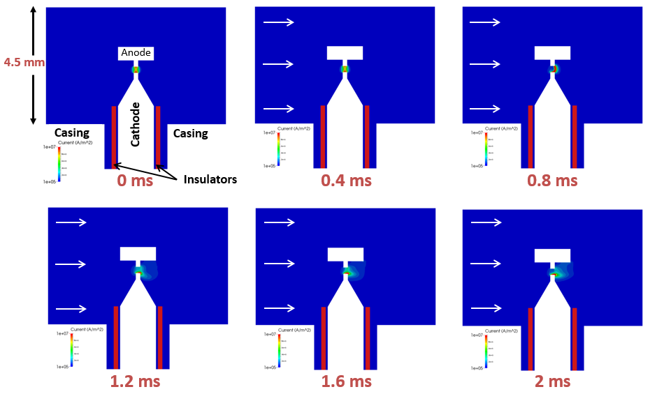アークプラズマシミュレーションソフトウェア VizSparkによる、 電極周辺の絶縁体まで考慮した、大気中のスパークプラグのシミュレーションです。放電経路が、気流により風下に動いています。 電極(Anode)の針部分から平板部分への、放電箇所の飛び移りが再現できています。