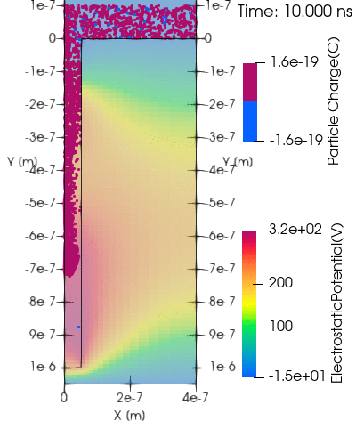 動画の赤い点がCF3+イオン、 青い点が電子です。 イオンが堆積して、溝の底がプラスに帯電していきます。動画の背景の色が、青から赤に変わってきます。
