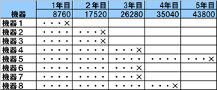 図1中の×印は、故障を表します。「・・・」は、正常に稼働していることを表します。機器1は、1年目で故障、機器2は、2年目で故障の様に機器8まで管理が出来ています。 故障の状況を評価するために、上図の状況をヒストグラムで表すと以下のとおりとなります。